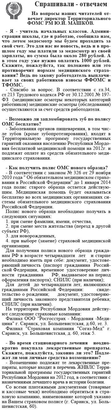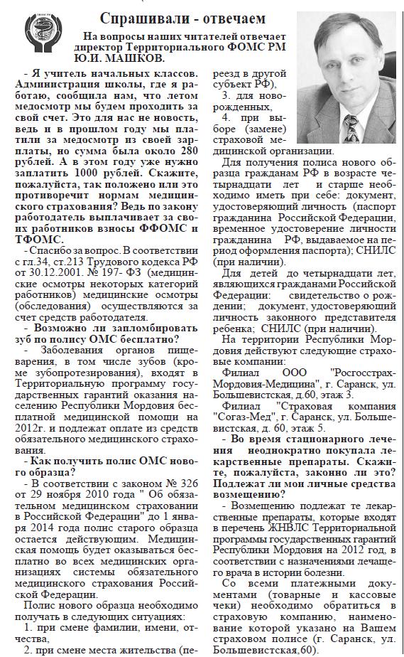 Газета "Известия Мордовия" публикует ответы на вопросы, которые приходят в рубрику Обратная связь на сайте ТФОМС РМ